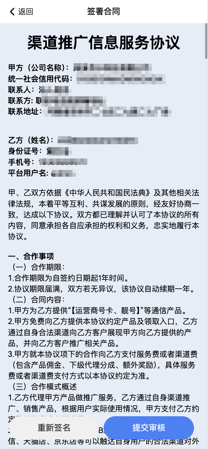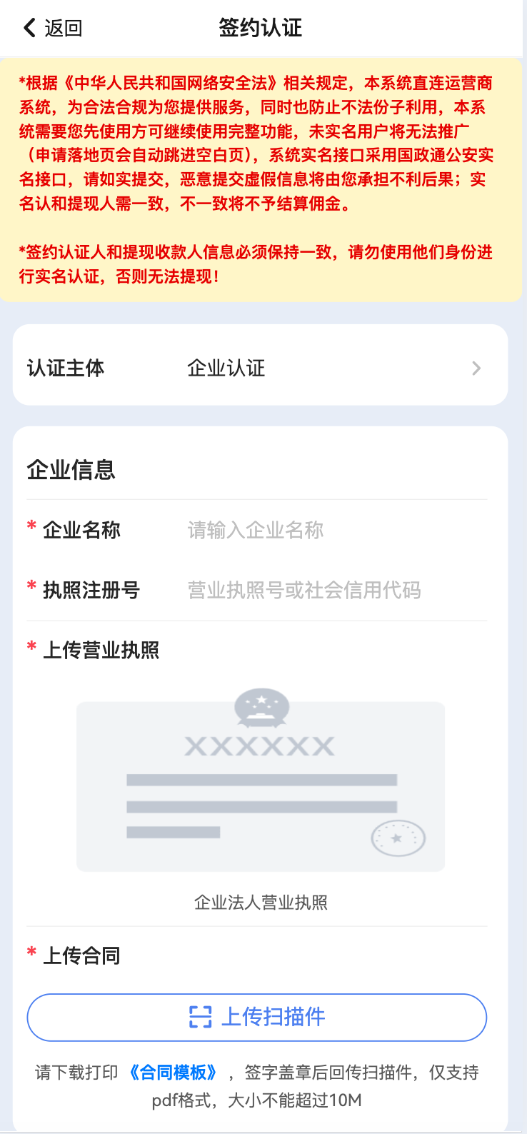 | 企业合同模板 | 企业合同暂不支持电子签约模式:代理商需下载平台上传的合同模板,打印纸质版签署后上传扫描件;后续平台审核无误,将打印签署并回传双方已签署的合同扫描件。认证通过后,双方均可在 “签约认证” 模块下载合同文件 |