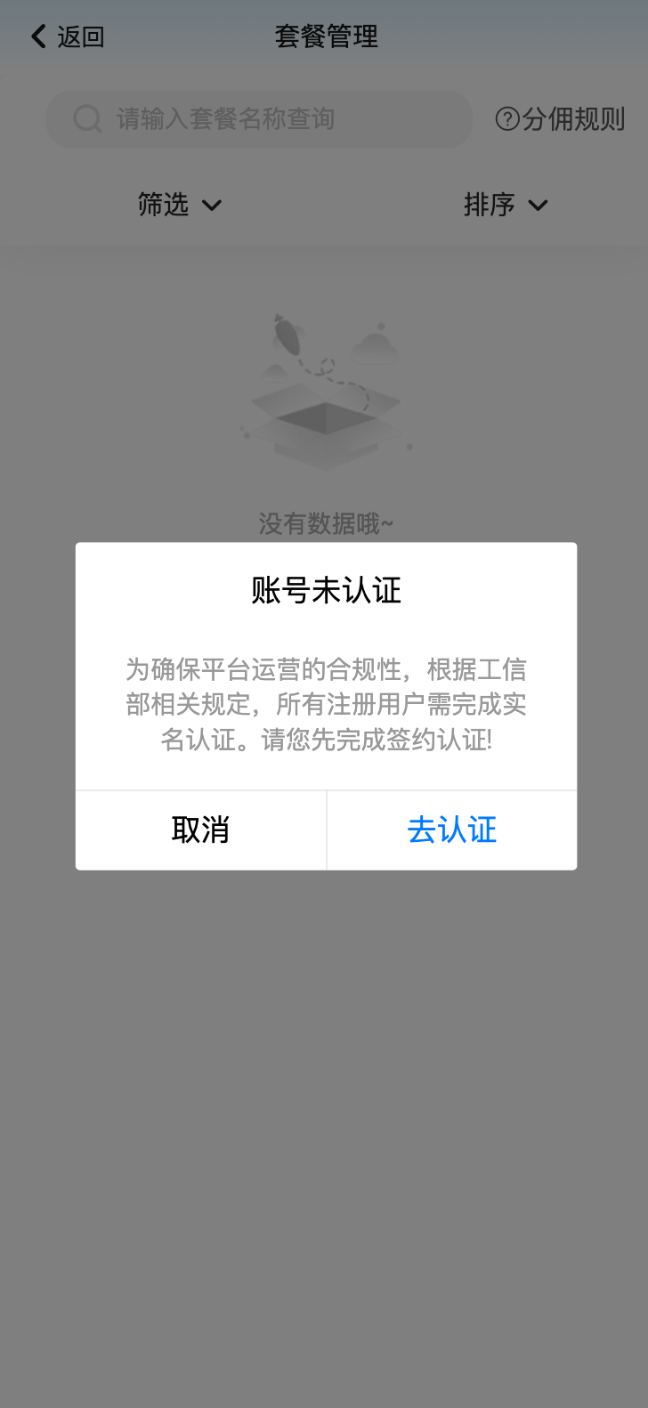 - 若未认证则不允许查看下游代理商、在售商品列表、商品详情、靓号列表、物联套餐等分销功能数据,会弹出弹窗提醒并引导用户前往认证