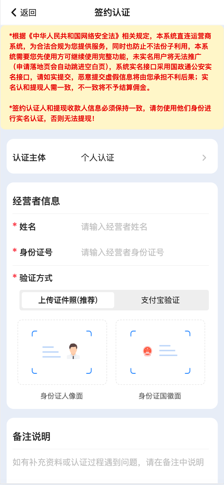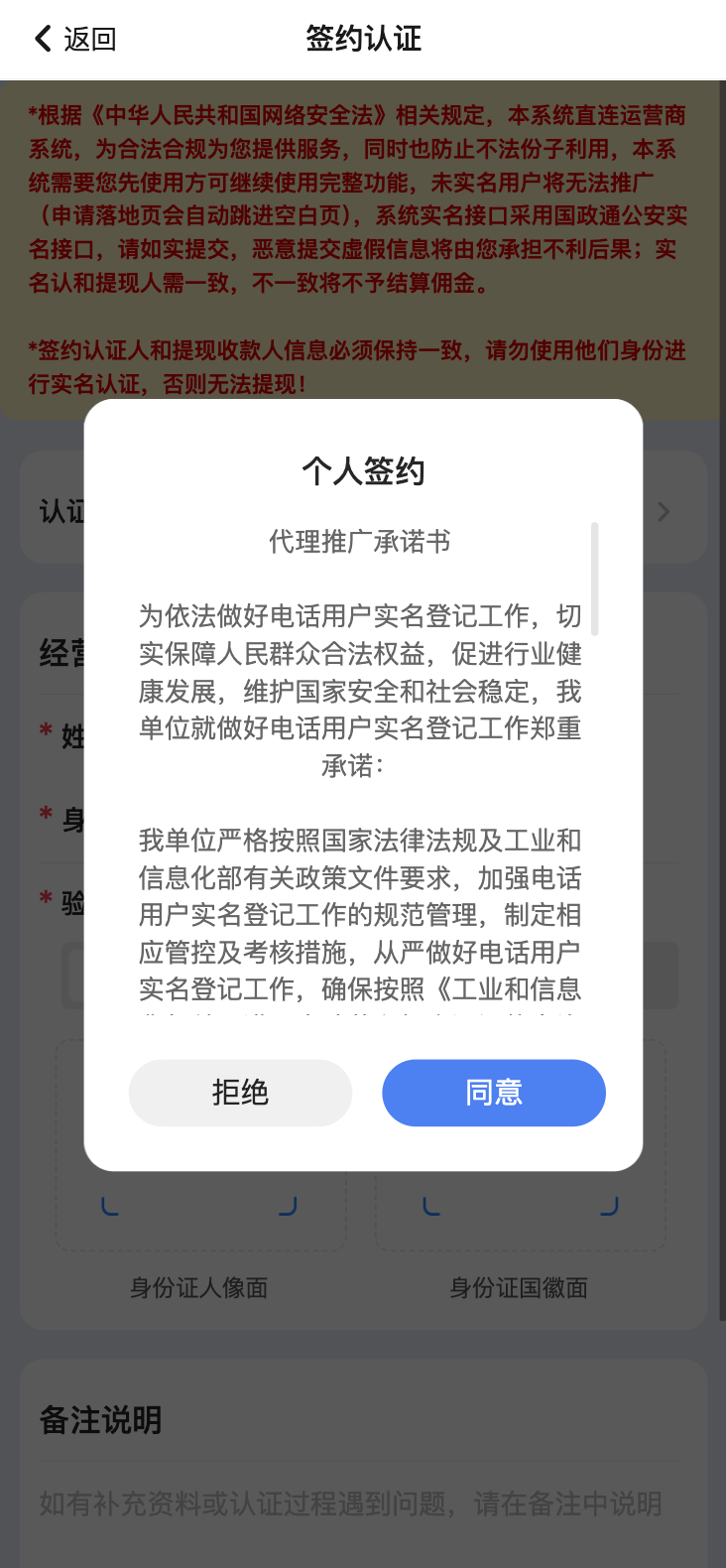 | 个人认证提示内容 | 代理商选择个人认证时,弹出的确认内容。代理商必须同意否则不允许下一步操作 |