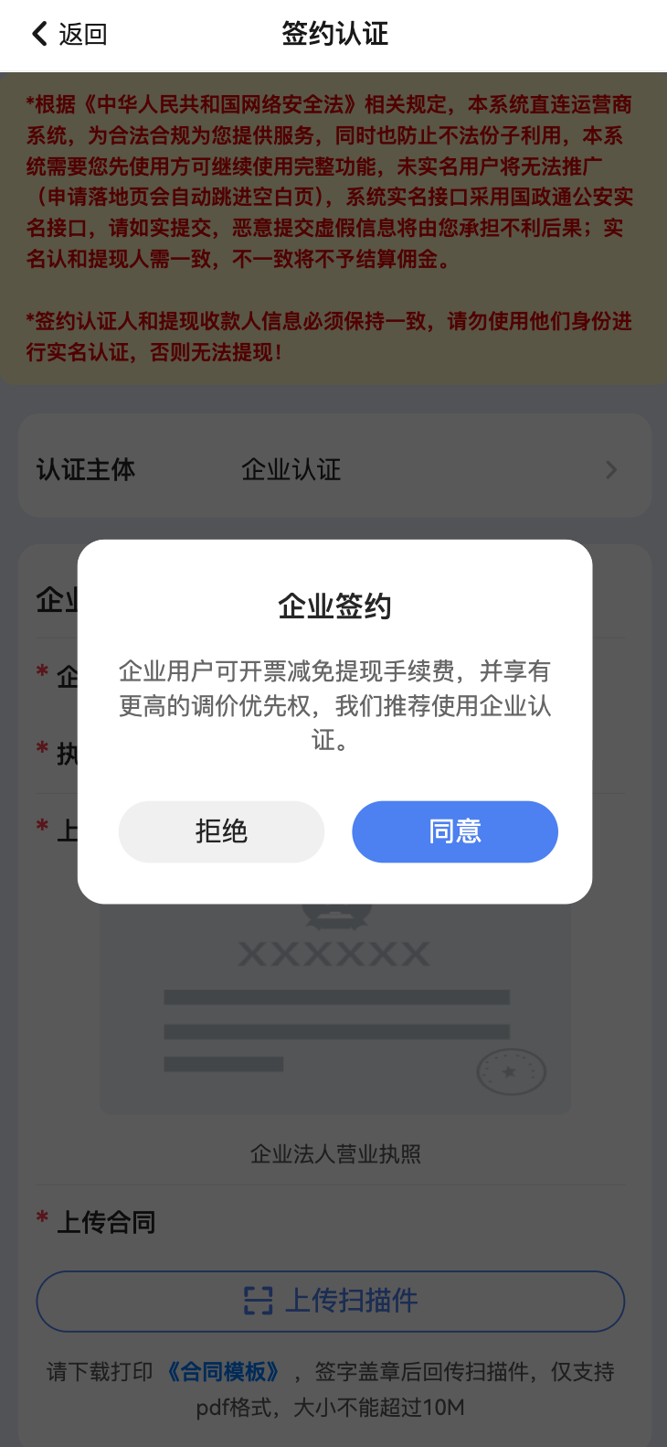 - 若未完成签约认证会弹出弹窗提醒并引导用户前往认证